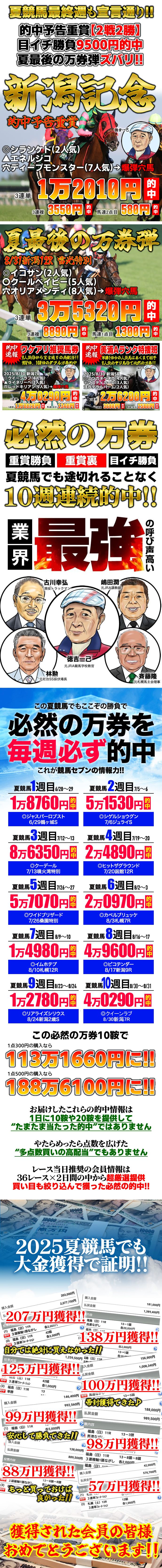 夏競馬の締め括りはばっちりでした。もっと強気に買えばよかったと少し後悔しています(笑)秋競馬も楽しみにしています。よろしくお願いします!