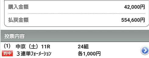 今週は土曜にホープフルSの5万5140円的中もあったし、日曜は中山10Rで10万7060円的中という特大配当もあり、なかなか良い中央競馬最終週になったんじゃないかな。