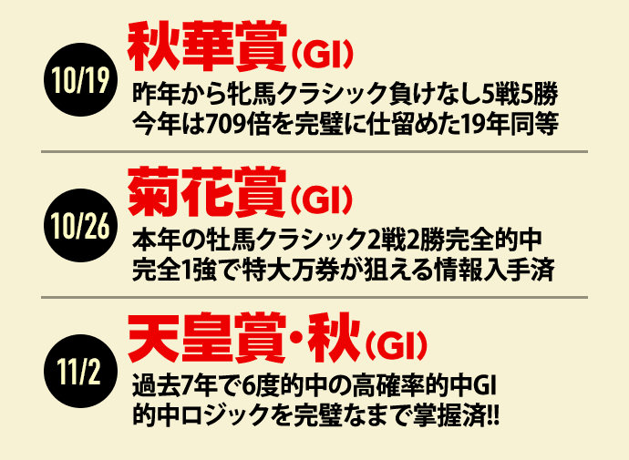 いよいよ翌週の秋華賞から、菊花賞、そして天皇賞(秋)とGI・3連戦を迎えます。